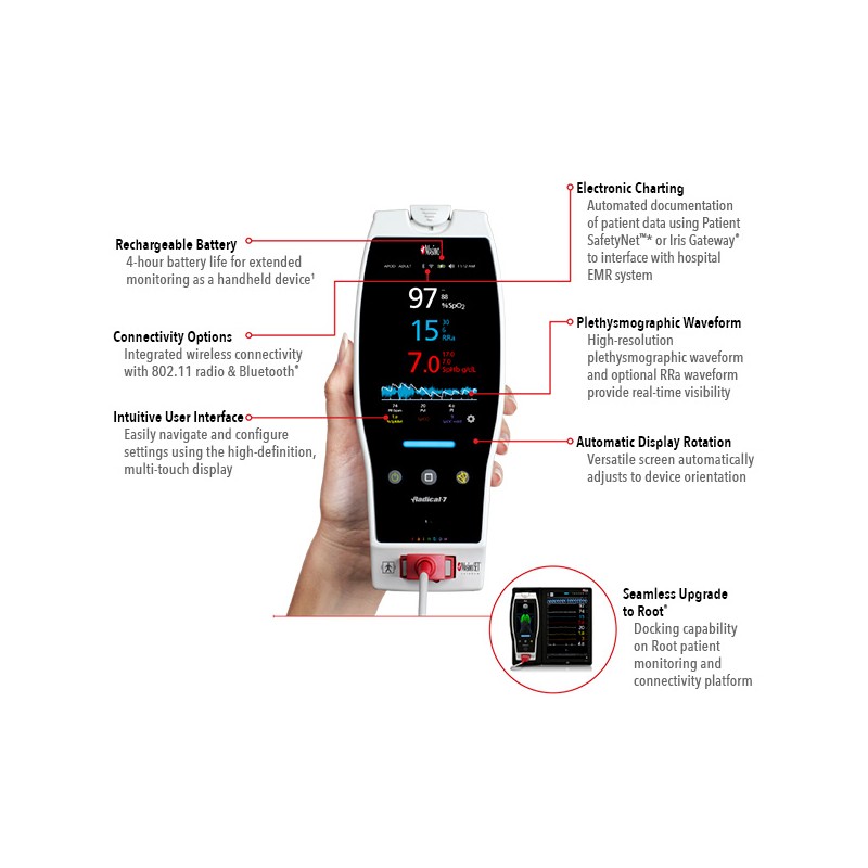 Equipamento para mensuração não invasiva e contínua da saturação periférica de oxigênio (SpO2) no sangue em condições de baixa perfusão e movimento através da tecnologia Masimo SET em pacientes neonatais, infantis e adultos, através de sensor infravermelho, bem como a mensuração da freqüência de pulso (PR), índice de perfusão (Pi) e índice de variabilidade pletismográfica (PVi).